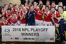 During the off-season there were a number of departures.[19] The club signed Kene Eze, an American striker who previously turned out for Pittsburgh Riverhounds.[20][21] North Geelong announced that a partnership had been formed with NPL South Australia side Adelaide Raiders, a fellow Croatian-Australian founded soccer side.[22] North Geelong travelled to Gepps Cross and, on 6 February, won the first ever Friendship Cup against Adelaide Raiders by a score of 2–1. The league competition started with a trip to sister-club St Albans which finished in a 1–1 draw.[23] North Geelong moved into outright top spot of the NPL2 West ladder after a 1–0 win over Brunswick City, a match in which Nicholas Jurčić tapped in a 93rd-minute winner.[24] A tough run of results followed, with the Warriors winning just one of the next seven games in the league, slipping to fourth position on the ladder. North exited the 2016 FFA Cup at the hands of South Melbourne in Round 6 with a 0–2 loss at bogey ground JL Murphy Reserve. The Warriors went undefeated in the last ten games of the season, pushing the title race to the last day. St Albans took out the NPL2 West title and automatic promotion on the final match-day with a 1–0 win over Whittlesea Ranges while North Geelong took second place and a spot in the NPL2 promotion playoff against NPL2 East runner-up Dandenong Thunder.[25] The Warriors produced a mercurial performance in the NPL2 promotion playoff, defeating the fancied Thunder 4–1, with Michael Anderson grabbing a hattrick.[26] North then faced Richmond in the NPL promotion / relegation playoff and confirmed an immediate return to the top fight of Victorian soccer with a 4–0 win, Matt Thorne scoring twice with Michael Anderson and Michael Simms adding singles in another emphatic win.[27]
