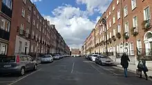 There is some speculation over which George the street is named after however it is likely King George III[3] who was reigning monarch at the time of the street's construction.[4] The nearby Church of Ireland parish of St. George and both the earlier Old Church of St George (1668) on Hill Street (previously Lower Temple Street) and the newer church of St George (1802) at Hardwicke Place are within a short walk of the street and may have influenced the naming convention.[5] The street was originally simply named George's Street prior to the laying out of South Great George's Street.