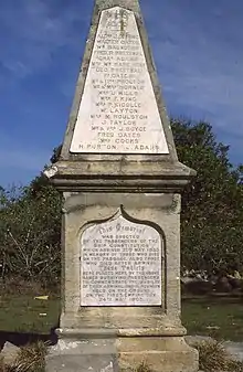 A prominent sandstone obelisk 9.1-metre-high (30 ft) stands on the south-eastern edge of the Station. An obelisk is shown at this location on site plans dating from 1807 to 1809, though it is not known if the existing one is the original. The memorial is in fair condition but requires some stonework repairs at the base. It may prove to be highly significant, if it is the original, as the oldest surviving structure on North Head and one of the oldest on Sydney Harbour. The obelisk is one of the few landscape elements relating to a non-quarantine function, though as navigation markers they relate to the overall maritime themes that include quarantine.[1]