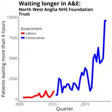 The trust was one of 26 responsible for half of the national growth in patients waiting more than four hours in accident and emergency over the 2014/5 winter.[11]