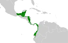 It is found from southeast Mexico to western Colombia and Venezuela. Its natural habitats are subtropical or tropical moist lowland forests and subtropical or tropical moist montane forests.