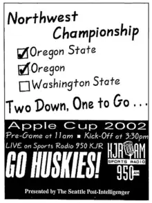 In 2002, the Huskies wore homemade t-shirts to mark their progress towards the Northwest Championship. The football undershirts had three blank boxes labeled for the other northwest schools, which the players checked off after each win.[1][8][19]