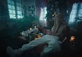 An accompanying music video was released simultaneously with the song. The visual was directed by Venezuelan director Edgar Esteves, and filmed on April 23, 2021.[36] It depicts the three musicians partying at a sensual house party, as each of them dance along to the record.[2][7] The video begins with Rvssian arriving with a girl and entering the house. In the next scenes, he flirts and spares with his lover. Alejandro starts singing for a woman in a bathtub, and then the scene switches as Brown begins singing his verses.[9]