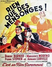 Nothing But Lies (French: Rien que des mensonges) is a 1933 French comedy film directed by Karl Anton and starring Robert Burnier, Marguerite Moreno and Jackie Monnier.[1] [2] It was produced by the French subsidiary of Paramount Pictures at the Joinville Studios in Paris. The film's costumes were designed by René Hubert.