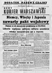 Nowy Kurier Warszawski, initially Nowy Kurjer Warszawski ("New Courier of Warsaw") was a German propaganda newspaper issued in the occupied Poland during World War II. Its name was coined after a popular pre-war newspaper Kurier Warszawski, with which it had nothing to do but the name. According to German sources the newspaper was issued in 200 000 copies daily, but it was commonly boycotted by the Poles (often defaced with the Kotwica) and the numbers seem to be much overestimated.