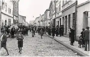 According to records, historic Nowy Sącz was populated by the Jews at least since 1469.[4] Throughout centuries Jews contributed greatly to the town's overall economy. Most Jewish families lived in the Zakamienica neighbourhood by the Kamienica river. The first brick-and-mortar synagogue was built at Nowy Sącz in 1699, tax-exempt.[5] Nowy Sącz was an influential centre of Hasidic Judaism and the Zionist movement dating back to the 19th century. Some 30% of the total population of 34,000 residents of Nowy Sącz were Jewish before the German-Soviet invasion of Poland in 1939.[1] In the city centre 90% of tenement houses were owned by Jews.[4]