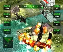 The game features five different terrain settings, with each level played on a large map divided into several missions.[8] These missions include seek-and-destroy, search-and-rescue, escorts, the destruction of bridges,[7] supply drops and air support. In some sections the player forms part of a coordinated attack with AI-controlled allies, while in others the player directs ground troops[8] in the style of a real-time strategy game.[9] In addition to engaging in combat, the player must avoid running out of fuel and ammunition.[7] The heads-up display shows this information, along with intelligence on missions objectives and on friendly and enemy units and their locations.[8] The compass indicating mission objectives is a feature new to Nuclear Strike,[7] as is a radar showing the positions of nearby enemies.[8]
