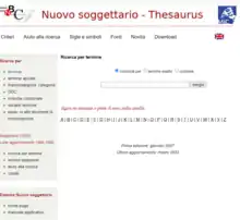 The Nuovo soggettario is a subject indexing system managed and implemented by the National Central Library of Florence (Biblioteca nazionale centrale di Firenze, BNCF), that in Italy has the institutional task to curate and develop the subject indexing tools, as national book archive and as bibliographic production agency of the Italian National Bibliography.[1] It can be used in libraries, archives, media libraries, documentation centers and other institutes of the cultural heritage to index resources of various nature (texts, images, sounds, web sites, etc.) on various supports (analog, digital)