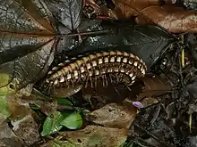 Nyssodesmus python also known as the python millipede or large forest-floor millipede is a species of flat-backed millipede of the family Platyrhacidae commonly found in Costa Rica, where it occurs widely and is locally abundant in the Caribbean slopes from sea level to around 365 meters (1,200 feet) in elevation.[1][2] Individuals reach lengths of up to 10 cm (4 in), and are conspicuously colored in yellowish tan with brown or black stripes. Their appearance is sometimes likened to a human spine. These millipedes are often encountered in pairs, with the male straddling the back of the female long after mating, to prevent other males from fertilizing the female's eggs before she lays them.[3]