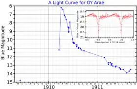 ![]() A light curve for OY Arae. The main plot (from data published by Walker and Shapley)[1] shows the 1910 eruption, and the inset plot (adapted from Zhao and McClintock)[2] shows the eclipse light curve measured in 1995. | |