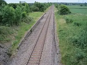 There were short (150 ft) stone platforms, each with a small corrugated iron shelter.[1] After the halt was closed in 1964,[2] the platform on the up London Paddington line remained until October 2013 when it was dismantled as part of the Swindon to Kemble redoubling works.