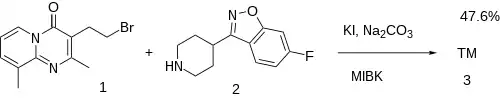 The last step requires attachment of the sidechain between 3-(2-bromoethyl)-2,9-dimethyl 4H-pyrido[1,2-a]pyrimidin-4-one, CID:18995805 (1) and 6-fluoro-3-(4-piperidinyl)-1,2-benzisoxazole [84163-77-9] (2) completing the convergent synthesis of Ocaperidone (3)..