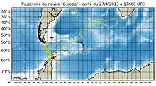 The two first campaigns carried out are: The ARTIC MISSION 2012[8] on the schooner La Louise[9] in the Baffin Bay between 65° and 70° North; the 96-days ANTARCTIC MISSION 2013,[10] on the three-master Bark EUROPA[11][12] (Netherlands) between 50° and 63° South, especially in the Drake Passage.