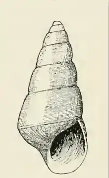 The very regularly elongate-conic shell is subdiaphanous to milk-white. Its length measures 5.6 mm. The whorls of the protoconch are small, deeply obliquely immersed in the first of the succeeding turns, above which the tilted edge of the last turn only is visible. The seven whorls of the teleoconch are slightly rounded, and separated by constricted sutures. They are marked by numerous slender, wavy subequal and subequally closely spaced spiral striations, of which about 33 occur upon the last turn between the summit and the periphery. The periphery of the body whorl is marked by a slender raised keel, decidedly angulated. The base of the shell is short, moderately rounded. It is narrowly attenuated anteriorly to reinforce the columella, sculptured like the posterior portion of the whorls. The ovate aperture is very broad and slightly effuse anteriorly. The posterior angle is acute. The columella is very slender, evenly curved, closely appressed to the attenuated base, with a strong fold at its insertion, which is barely visible when the aperture is viewed squarely.[3]