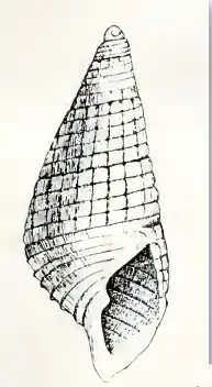 The conic shell is crystalline, and shining. It measures 3.6 mm. The whorls of the protoconch number one and one-half, and are the greater part immersed in the first of the succeeding turns. The five whorls of the teleoconch are flattened. They are marked by four spiral ridges between the sutures and axial ribs, the intersections of which form low squarish tubercles of which about 11 occur upon the second and 18 upon the penultimate whorl. The sutures are poorly impressed. The periphery of the body whorl is marked by a spiral cord. The base of the shell is attenuated, marked by six equally spaced spiral cords and slender axial threads in the grooves between the cords. The aperture is oval. The posterior angle is acute. The outer lip is thin, showing the external sculpture within. The columella is moderately strong, slightly curved, and provided with a strong fold a little below its insertion.[3]