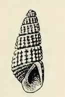 The elongate-conic shell is vitreous. It measures 2.8 mm. The whorls of the protoconch are small, smooth, and almost completely obliquely immersed in the first of the succeeding turns, above which only the tilted edge of the last volution projects. The six whorls of the teleoconch are flattened, strongly contracted at the sutures and moderately shouldered at the summit. They are marked by strong, tuberculate retractive axial ribs, of which 18 occur upon the first and second and 20 upon the remaining turns. In addition to these axial ribs the whorls are marked by four slender, spiral cords between the sutures, which pass over the axial ribs and render them tuberculate at their junction. The spaces enclosed by the ribs and cords are rectangular pits, which have their long axis parallel with the spiral cords. The sutures are channeled. The periphery of the body whorl is marked by a spiral groove. The base of the body whorl is well rounded, and marked by eight spiral cords which grow successively weaker and closer spaced from the periphery to the umbilical area. The wide grooves between the spiral cords are marked by slender, raised, axial threads, which correspond to the ribs on the spire. The aperture is ovate and somewhat effuse anteriorly. The posterior angle is obtuse. The outer lip is thin, showing the external markings within. The columella is stout, strongly reflected, and provided with a slender fold at its insertion. The parietal wall is covered by a strong callus.[4]