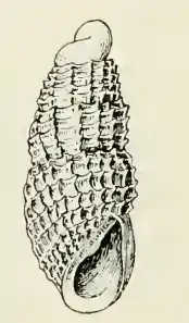 The white, small shell has a pupiform shape. The whorls of the protoconch number at least two. They form a depressed helicoid spire, whose axis is at right angles to that of the succeeding turns, in the first of which it is about one-half immersed. The five whorls of the teleoconch are well rounded, moderately contracted at the suture, slightly shouldered at the summit. They are marked by strongly raised, narrow, somewhat retractive axial ribs, of which 12 occur upon the first, 14 upon the second, and about 20 upon the penultimate turn. In addition to the axial ribs the whorls are marked between the sutures by five strong, narrow, spiral keels which render the intersections of the ribs cuspidate. The sutures are well impressed. The periphery and the base of the body whorl are well rounded. They are marked by the strong continuations of the axial ribs and five spiral keels, similar to those between the sutures. The aperture is pear-shaped. The outer lip is thin, showing the external sculpture within. The columella is strongly curved and revolute. It is provided with a weak fold at its insertion. The parietal wall is covered with a thin callus. [4]