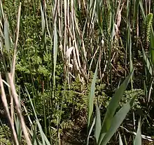 Its main habitat throughout its range is reed swamp (European C5.1a "tall helophyte beds"),[19] where it is generally scarce but sometimes appears in abundance when the reeds are cut or disturbed.[20] It is generally more abundant, however, in pools with a fluctuating water level, where it can germinate and rapidly grow on bare mud in the summer. Other habitats for it include ditches, canals, streams, rivers, wet woodland, and degraded mires.[21] Its National Vegetation Classification communities include W1 grey willow, W5 alder and W6 crack willow woodlands; OV30 drawdown zone vegetation; S4 common reed, S12 reedmace and S28 reed canary-grass reedbeds; and S27 marsh cinquefoil bog. Sometimes it occurs on silty, mineral soils in places such as farmland ponds, but more often it is found on fenland peat.[22][23]