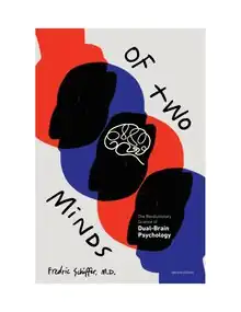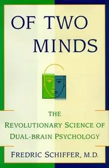 Of Two Minds: The Revolutionary Science of Dual-Brain Psychology is a book written by the American psychiatrist Fredric Schiffer (MD degree in 1971)[1] wherein he proposes that each person behaves as if there are two minds within the person, and that by recognizing and relating to the two separate minds, the therapist can promote healing and understanding of problems such as depression, anxiety, addictive behavior and delusional thoughts.[2] The author writes that by "two minds in one person"[3] he means that a "part of an individual ...has a unique set of memories, motivations, and behaviors alongside another part of him which has a different unique (though possibly similar) set of memories, motivations and behaviors." (Schiffer 2nd edition, 2021, p.30) The author locates a "mind" in each of the two physical halves (hemispheres) of the brain.[4] and he "maintains that one hemisphere can be more immature than the other and that this imbalance leads to different mental disorders."[5] During his counseling, as an exercise he has his patients cover all of one eye, and the inner half of the other eye, which the author feels selectively stimulates one cerebral hemisphere more than the other – activating the thoughts and feelings of that hemisphere – which allows one to "'talk' to each half of the brain separately, to learn which is less mature, and to bring the two hemispheres into harmony."[6]