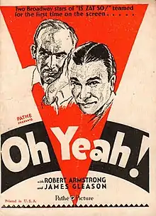 Oh, Yeah! (also written as Oh, Yeah?) is a 1929 American pre-Code action film directed by Tay Garnett and starring Robert Armstrong, James Gleason and Zasu Pitts. The film's sets were designed by the art director Edward C. Jewell. An early sound film, it was made during the transition from the silent era. It is also known by the alternative title No Brakes after the original story it is based on that appeared in The Saturday Evening Post.[1]