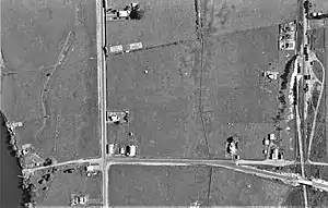 ![]() 1940 aerial view of the Waikato River (left), Great South Rd at Ohinewai and Ohinewai railway station (right). The Waikato Expressway now runs through the centre | |