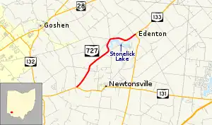 State Route 727 (SR 727) is a north–south state highway located in the southwestern portion of the U.S. state of Ohio. SR 727 has its southern terminus at a T-intersection with SR 131 approximately 1.50 miles (2.41 km) west of Newtonsville. The highway's northern terminus is at a T-intersection with SR 133 nearly 5.25 miles (8.45 km) southwest of Blanchester in the unincorporated community of Edenton. The route provides access to Stonelick State Park.
