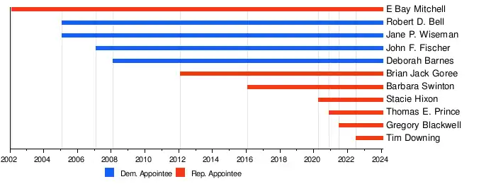 This graphical timeline depicts the length of each current judge's tenure (but not seniority) on the Court: