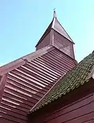 The building from 1692 still stands today. It is representative of typical Norwegian church architecture from the period after the Reformation. Although changes were made to its walls, the church has retained most of its original features. The most significant change was made around 1720, when the church was painted red and embellished with flower motifs. During that same renovation project the ceiling was painted blue and stars were drawn on it. At the back of the church building is a christening house or front house. In the old days, babies were christened in this room. It was the custom in those days to then carry the baby from this room to the altar.[4][7]