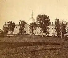 In 1825, the Main College consisted of two three-story 75 feet (23 m) x 36 feet (11 m) buildings known as the "North and South Colleges". A third three-story building (with a length of 86 feet (26 m)), known as the "Middle College" was erected between the two in 1829. Each of the buildings was constructed about 7–8 feet apart to prevent fire from destroying the entire facility, as had occurred previously in 1824. In 1846, the buildings were connected, however they were not accessible to one another within.[3] The building has undergone substantial renovations during several times.