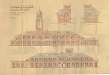 Constructed in a style similar to the great 19th century railway stations of Europe and Great Britain, the three-storey red brick structure is located on the corner of Flinders and Blackwood Streets at the western end of the Townsville central business district. The facade of the building features balustraded verandas on the first and second storeys of the building's facade, with two prominent gabled extrusions from the main structure which identify the passenger and administrative entrances the building. The facade of the building also features a large awning supported by large iron brackets. The main roof of the structure is hipped with a number of small side-structures at the eastern end of the building, which also feature hipped roofs. A four-storey brick addition was erected at the western end of the building in 1965 and features a distinctly different architectural style to the rest of the structure.[2]