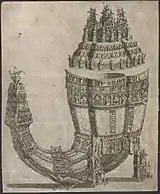 In the 13th and 14th centuries, drinking horns were treasured objects and prized heirlooms among the elite. It was not uncommon for them to be regularly recycled inside close families and kin-groups. The Oldenburg Horn stands out from these earlier drinking horns, being the first such horn in Denmark not made from a bovine horn.[1] It was made for Christian I of Denmark by an unknown silversmith in around 1465. It is believed that he intended to use it as a gift to the Three Kings in Cologne Cathedral on his journey to Rome in 1474–1475. Some sources state that he brought it back with him.[2][1][3] In 1690, it was transferred from Oldenburg to Copenhagen by Christian V for inclusion in the Royal Collections at Rosenborg Castle. In 1939, Rosenborg Castle was opened to the public.[3]