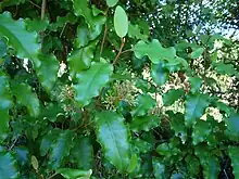 Olearia paniculata is a small evergreen tree that is indigenous and commonly found in both the North and South Islands of New Zealand.[2] It has reddish twigs bearing very smooth and wavy-edged oval green leaves that are white underneath and twigs that are grooved on the top surface and angular in cross-section.[3] It can grow up to about 6 meters tall.[4] Olearia paniculata branchlets are grooved, sharp-cornered, very short and grow up to short lengths such as 2-4 centimeters.[4] Flowers are small, white, and in dense clusters.[3] Petiole of the akiraho plant which exists as a stalk that attaches the leaf blade to the stem which grows up to 5 millimeters long.[4] It also has a white thin appressed white to buff tomentum below.[4] Olearia paniculata also has a sweet smell to it and is looked at by many people as used for creating hedges.[5] The genus is named after Johann Gottfried Olearius, a 17th-century German scholar and author of Specimen Florae Hallensis.[6] Paniculata, on the other hand, means “Small sprayed”.[3] Olearia paniculata leaf margins can be flat or strongly wavy.[4]