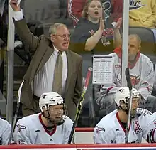 The Mavericks were coached by Mike Kemp between the program's inception in 1997 and 2009.[8] Prior to the 1997 season, Kemp served as an assistant coach for 14 years at Wisconsin. In his only previous head coaching stint, Kemp was the coach of the UNO club hockey team during its brief existence in 1975 and 1976.[8] Kemp is credited with helping build the nascent program over his tenure, and eventually led the team to its only NCAA Tournament appearance to date in 2006. After the 2004–05 season, he was named CCHA Coach of the Year.[46] He was named Associate Athletic Director for UNO following the 2009 season.