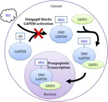 Omigapil inhibits programmed cell death (apoptosis) through the enzymes glyceraldehyde 3-phosphate dehydrogenase (GAPDH) and SIAH1. The glycolytic housekeeping enzyme GAPDH is mediated by neuronal nitric oxide synthase.[9] Once activated by nitric oxide, GAPDH binds to the ubiquitin ligase SIAH1, and is transported to the nucleus where it activates the acetyltransferases p300/CBP to enhance acetylation and subsequent transcription. GAPDH's targets proapoptotic genes such as p53, p53 upregulated modulator of apoptosis (PUMA), and p21 as well as other related targets.[10] Chemogenetic studies indicate that omigapil inhibits this proapoptotic signaling cascade by preventing GAPDH activation through S-nitrosylation, which in turn prevents the binding of SIAH1 and translocation to the nucleus (see figure).[11] Multiple binding cites on GAPDH have been suggested.[12]