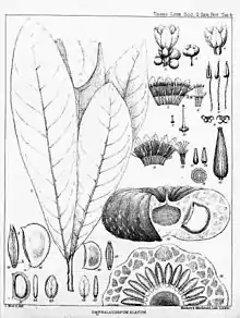 The tree is some 30 m (98 ft) tall and about 80 cm (31 in) in diameter at breast height, with a straight trunk which is fluted near its base and having no buttresses. Its bark is scaly and reddish-brown in color with lenticels in vertical rows, its slash showing as pinkish-brown with copious white latex. Leaves are alternate and simple, up to 25 x 8 cm in clusters at the ends of branchlets, oblanceolate with obtuse-rounded apex, and decurrent base. The secondary venation is parallel and the abaxial leaf surfaces are glabrous. The flowers resemble those of Mimusops,[4] the inflorescences occurring in fascicles, with 4-6 flowers per fascicle. The calyx is made up of 5 sepals, each 5–12 mm long; the corolla tube and lobes are 9–17 mm long; the stamens are 12 mm long. The ovary is 5-locular. Fruits grow from the trunk, are flattened sub-globose in shape (oblate spheroid), some 15 x 8 cm, with a hard exocarp and whitish pulp, holding numerous seeds. The species may be found flowering and fruiting throughout the year where climatic conditions are suitable. The fruit takes about one year to mature and ripen.[5][6]