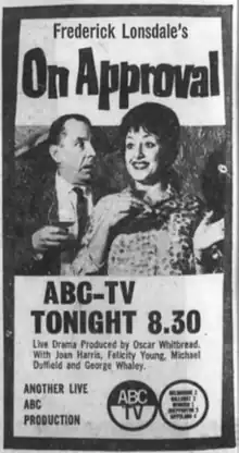 On Approval is a 1964 Australian television play based on the play by Frederick Lonsdale. It was adapted by Noel Robinson.[4]