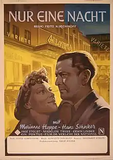 Only One Night (German: Nur eine Nacht) is a 1950 West German drama film directed by Fritz Kirchhoff and starring Marianne Hoppe, Hans Söhnker and Willy Maertens.[1] It was shot at the Tempelhof Studios in West Berlin. The film's sets were designed by the art director Ernst H. Albrecht. Location shooting took place on the Reeperbahn in Hamburg.