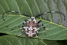 Onychocerus albitarsis is a relatively rare species of beetle in the family Cerambycidae from the Amazon and Atlantic forest regions in Brazil, Bolivia, Paraguay and southern Peru.[2][3][4] It is remarkable for being the only known beetle that has a venomous sting (as opposed to spraying toxins like bombardier beetles or secreting toxins from the body like blister beetles) and the only known arthropod that stings with its antennae.[2][3] Each antenna ends in a stinger that has evolved to resemble a scorpion's tail and it is connected to a venom gland.[2][3] The sting was already reported in 1884 but researchers thought the pain only was caused by the sharpness of the antennae, as also known from some other beetles. It was only confirmed in 2005 that it is venomous when a biologist was stung, comparing it to a bee sting, and subsequently studied it in detail.[3] In the first of two other cases where the identity of the stinging insect was confirmed to be this beetle, a woman experienced significant pain directly after the incident, and redness and itching at the sting site that lasted for a week. In the other case a man experienced moderate pain directly after being stung and redness that only lasted for an hour.[2] The other species in the genus Onychocerus appear to not be venomous since they lack the structures inside the antennae that are associated with the venom apparatus of Onychocerus albitarsis.[3]