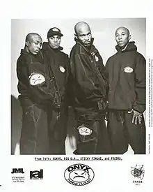 Onyx was formed in 1988 by schoolmates Fredro Starr, Sonny Seeza, and Big DS. They decided to name the band after the onyx stone.[12] The band began recording their first demos in the basement of B-Wiz with drum machine beats from an SP-12.[13] In 1989, Onyx signed Jeffrey Harris as their manager, who helped them secure a contract with the label Profile Records. On April 25, 1990, the group released their first single, Ah, And We Do It Like This, to low sales.[14][15] On July 13, 1991, while in a traffic jam at The Jones Beach GreekFest Festival, the band members met music producer Jam Master Jay,[16][17] who agreed to give them two months to submit a demo to his record company. When the deadline came, Seeza and Big DS couldn't make it to the studio to record the demo,[18] so Jeffrey Harris, the manager of Onyx, asked Fredro to come to the studio with his cousin, Kirk Jones, who at the time was doing a solo career under the name Trop. Fredro and Jones recorded two records for the demo, "Stik 'N' Muve" and "Exercise".[19] The demo were accepted by Jam Master Jay, who signed the band to his record label, Jam Master Jay Records. Jones subsequently joined the band with the stage name Sticky Fingaz. In 1991 the band lost all of its records when its music producer, B-Wiz, was killed while selling cocaine in Baltimore.[15] Later that year, Onyx hired Chyskillz as its new music producer.[13]
