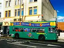 The widespread application of National Bus Company liveries from 1972 had little effect on the open top fleet although the shades used now were slightly different, but in 1976 the whole fleet except the vintage bus were turned out in varied colours that represented the defunct tramway systems in different towns where Bristol Omnibus operated. Each bus also had a picture representing that town painted on them and received Western names.[7]