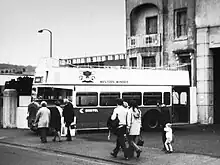 The Bristol Tramways and Carriage Company was renamed the Bristol Omnibus Company in 1957, 16 years after it had last operated any trams.[4] Their old converted vehicles were replaced by new purpose-built buses in 1961, by which time some buses ran beyond the Sanatorium to Uphill. These "convertible" buses had removable roofs that could be replaced in the winter to allow them to operate ordinary services. Although these buses carried the name "Bristol" on their sides, this was replaced a couple of years later with the coat of arms of Weston-super-Mare.[8] In 1966, when all the company's routes were renumbered,[9] the sea front service became number 103.[8]