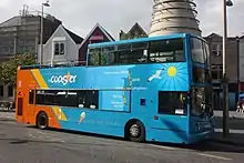 From 1979 the sea front route was extended to run beyond the Old Pier to Sand Bay as route 100, the whole route now being from Uphill to Sand Bay.[7] Driver-operated buses that did not require conductors were introduced in 1980, at first with a variety of second-hand vehicles. This saw the reintroduction of a cream and green livery and a "Coastrider" brand name was soon added. This brand was retained in 1982 when a new cream livery appeared with a pale blue skirt along the bottom of the sides. The word "coast" was in large pale blue letters beneath the lower deck windows with "rider" in cream immediately beneath on the skirt.[12]
