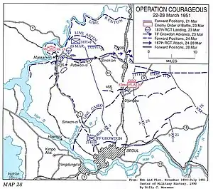Operation Courageous was a military operation performed by the United Nations Command (UN) during the Korean War designed to trap large numbers of Chinese People's Volunteer Army (PVA) and Korean People's Army (KPA) troops between the Han and Imjin Rivers north of Seoul, opposite the Republic of Korea Army (ROK) I Corps. The intent of Operation Courageous was for US I Corps, which was composed of the US 25th and 3rd Infantry Divisions and the ROK 1st Infantry Division, to advance quickly on the PVA/KPA forces and reach the Imjin River with all possible speed.