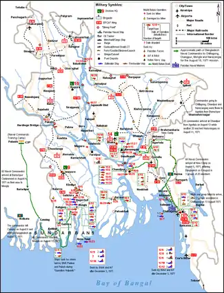 The Mukti Bahini Naval Commandos launched several sabotage efforts in the cities of Chittagong, Chandpur, Mongla, and the Narayanganj District against the operating combined forces of the Pakistan Soldiers, Pakistan Marines, Pakistan Navy SEAL Teams, and the East Pakistan Security Forces on the night of 15 August 1971.[4][5] Bengali submariners who had defected from Pakistani submarine PNS Mangro (S133), then based in Toulon, France, led the attacks, and this is also known as part of Operation Jackpot.[6] The Pakistani military initiated countermeasures to improve security by increasing door-to-door clearance and applied counterinsurgency tactics by the Army Special Forces and the Navy SEAL Teams, but this failed to curb Mukti Bahini activity.[7]