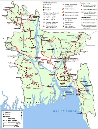 West Pakistani military leaders had not anticipated prolonged Bengali resistance or later Indian military intervention.[16] The main phase of Operation Searchlight ended with the fall of the last major Bengali-held town in mid-May 1971. The operation also directly precipitated the 1971 Bangladesh genocide, in which between 300,000 and 3,000,000 Bengalis were killed while around 10 million fled to neighbouring India as refugees.[17][18]