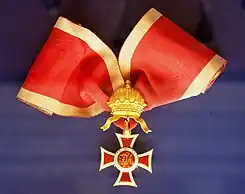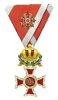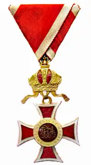 The Austrian Imperial Order of Leopold (German: Österreichisch-kaiserlicher Leopold-Orden) (Hungarian: Osztrák Császári Lipót-rend) was founded by Franz I of Austria on 8 January 1808. The order's statutes stipulated only three grades: Grand Cross, Commander and Knight. During the war, in common with the other Austrian and later Austro-Hungarian decorations, war decoration (represented by a laurel wreath) and/or swords were added to reward meritorious service and bravery in the face of the enemy.