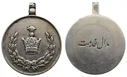 Order of Service (Persian: نشان خدمت) is an Iranian state general order. For the first time, it was established and awarded during the Pahlavi dynasty and during the reign of Reza Shah. After Iranian Revolution it was re-established by "Council of Iran Ministers" in November 21, 1990. The order has three classes. According to Article 12 of the Regulations on the Awarding of Government Orders of Iran, the Order of Service awarded by President of Iran to recognize "achieving distinguished success" in one of the following:[1][2][3][4]