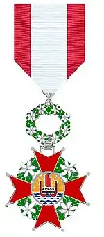 The Officiers carry in the same place an insignia of the same diameter, gilded, attached by a ribbon similar to that of the Chevaliers, but including a rosette.[5]
