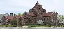 The last of the two churches of the 1890s was a spite building. William Stafford, a member of the Baptist Church and Orleans County District Attorney, ran for reelection and lost. He felt his loss was partly due to his fellow congregants failure to sufficiently support him. He sold the land he owned next to the Baptist Church to St. Joseph's Roman Catholic Church, which was outgrowing its current location on Main Street north of the Erie Canal. According to local legend, the property was sold under the condition that a new church on the property be built close enough to West Park Street to block the view of the Baptist church from Main Street. The Gothic Revival building, designed by an unknown architect, is smaller in scale and less decorated than the other churches, but does block the view to the Baptist Church from Main Street.[1]