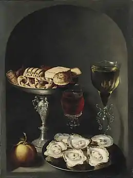 He was known for his paintings of oysters and confectionery goods displayed orderly on tabletops together with precious wine glasses and Chinese porcelain.[11] He was unmatched in his ability to depict oysters with light playing on the viscous and pearly flesh and the wetness distinguishing the oysters from the hard surface of the shell's interior. A good example is the Still life with oysters (National Gallery of Art, Washington), which shows oysters on a plate together with precious objects on a table extending on both sides outside of the canvas against a dark background.[12]